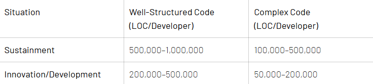 To dig deeper, I also looked up industry benchmarks for lines of code per developer in different situations, accounting for factors like sustainment versus innovation and well-structured versus complex codebases.